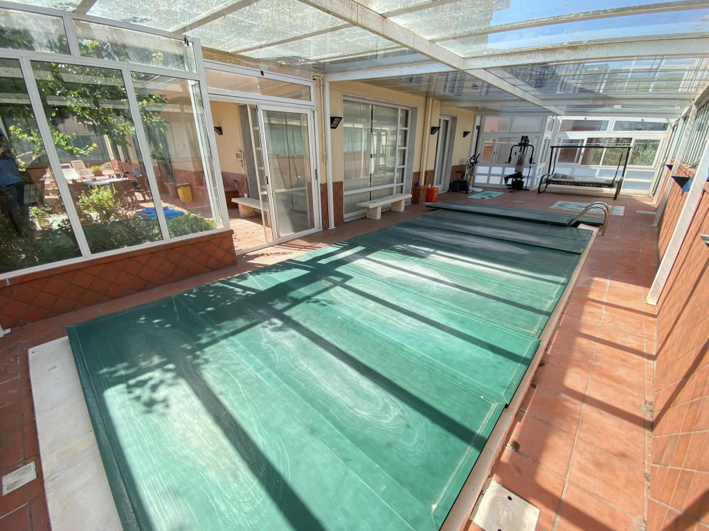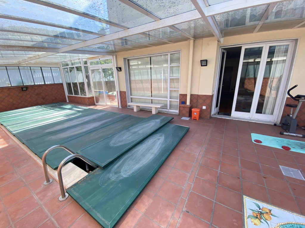 UN SALONE TRIPLO DAL QUALE SI ACCEDE DIRETTAMENTE ALL’AREA PISCINA COPERTA,